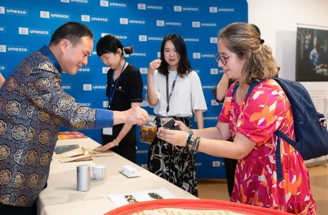 这场“茶和天下·苏韵雅集”活动在法国巴黎的联合国教科文组织总部举办,与会嘉宾们沉浸式体验手工炒制雨花茉莉红茶、碧螺春茶,闻香、看色、尝味……近距离感受中国茶文化的无限魅力。活动分“茶·源”“茶·韵”“茶·宴”“茶·礼”“茶·会”“茶·旅”六部分,借助主题展、文艺表演和互动体验等形式,系统介绍茶的历史,全方位、多维度呈现中国茶文化的丰富内涵,展示茶文化传承与保护的活力与成果。溧水区雨花茶制作技艺代表性传承人陈盛峰现场展示了茉莉雨花茶红茶制作技艺。