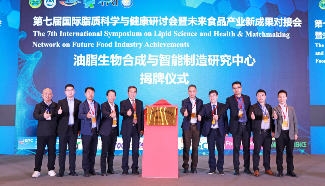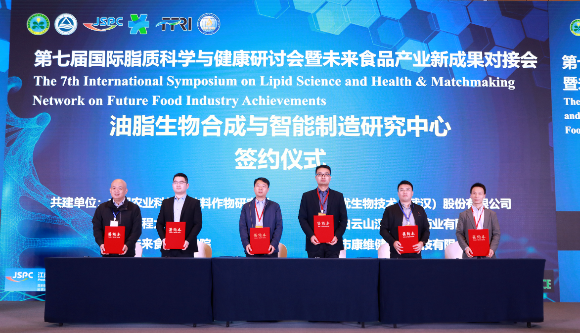 开幕式上,中国农业科学院油料作物研究所、嘉必优生物技术(武汉)股份有限公司、武汉工程大学、广州白云山汉方现代药业有限公司、白马未来食品研究院、惠州康维健生物科技有限公司等6家单位签订了“油脂生物合成与智能制造研究中心”共建协议,相关负责人共同为该中心揭牌。