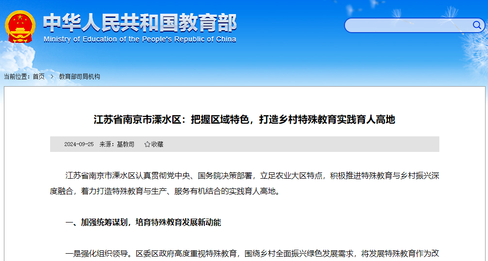近日,溧水区把握区域特色打造乡村特殊教育实践育人高地工作案例被教育部关注,并在其官方网站发布推介。