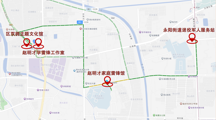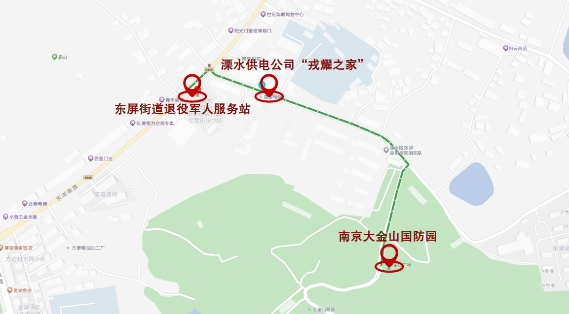 此次发布的三条双拥红色线路分别是位于东屏地区的南京溧水大金山国防园、溧水供电公司的“戎耀之家”、东屏街道人武部和退役军人服务站;位于主城永阳街道的区双拥主题文化馆(退役军人荣誉室)、赵明才学雷锋工作室、赵明才家庭雷锋文化馆、永阳街道人武部与退役军人服务站;位于白马、晶桥地区的新四军抗大九分校历史陈列馆、铜山战斗纪念广场、红色里佳山、红色李巷、苏南反顽战役阵亡将士纪念塔、中山烈士陵园等。