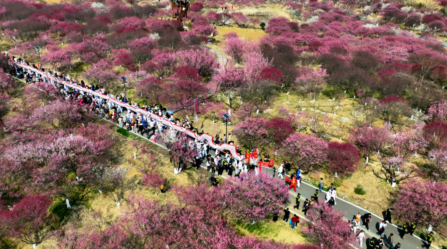 眼下,秦淮梅园正值盛花期,2600余亩梅花恣意绽放。当传承数百年的白色巨龙在千亩红梅间舞动,当非遗民俗遇见春日“梅”景,不得不说,这是属于石臼湖畔独具特色的溧水文旅新场景。