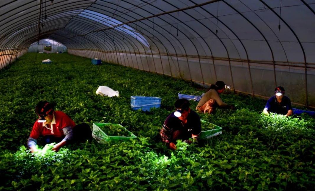 为保证净菜能够第一时间上架市场,工人们凌晨2时便头戴照明灯进入大棚采收。