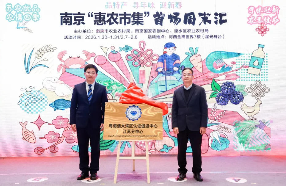 1月30日下午,南京“惠农市集”首场周末汇活动在河西金鹰世界举行。活动现场,广东省市场监督管理局党组成员、省知识产权保护中心党委书记、主任高国盛,南京国家农高区党工委书记、白马镇党委书记徒位国共同为粤港澳大湾区认证促进中心江苏分中心揭牌。