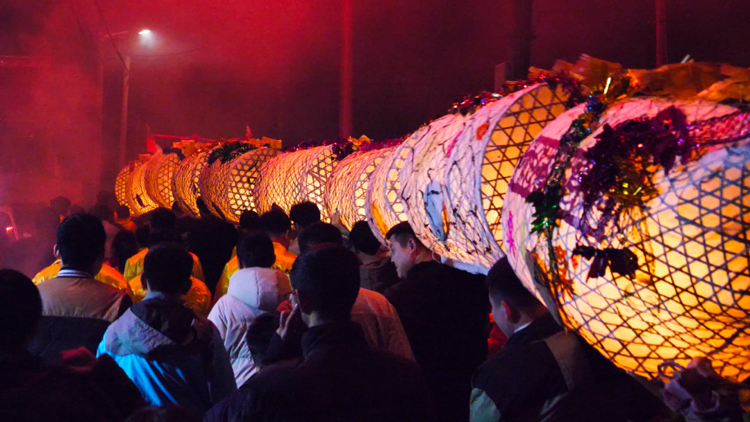 舞龙现场,200多人协同配合,在街头巷尾上下翻舞,远远望去,气势非凡。据介绍,何林坊双龙起源于清代乾隆年间,号称“江南第一板龙”,由一青一黄两条龙组成,龙身是用竹片编织而成,身上糊有青黄各色的纸张,里面放烛点亮。2023年,该项目被列为南京市非物质文化遗产。