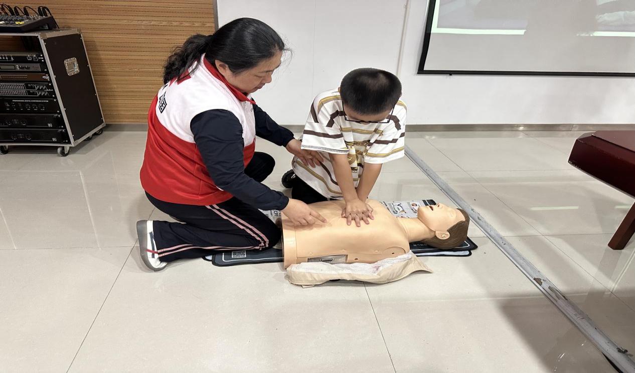 在互动练习环节,在郁老师和志愿者的指导下,孩子们积极在“模拟人”模型上练习心肺复苏的操作流程,初步掌握了判断意识、正确呼救、胸外按压、人工呼吸等关键步骤。此外,郁老师演示了自动体外除颤器(AED)设备的使用方法以及针对不同年龄段人群发生气道梗阻时的急救措施。现场气氛热烈,孩子们学习热情高涨,纷纷表示掌握这些急救技能增强了他们应对突发事件的自信心。