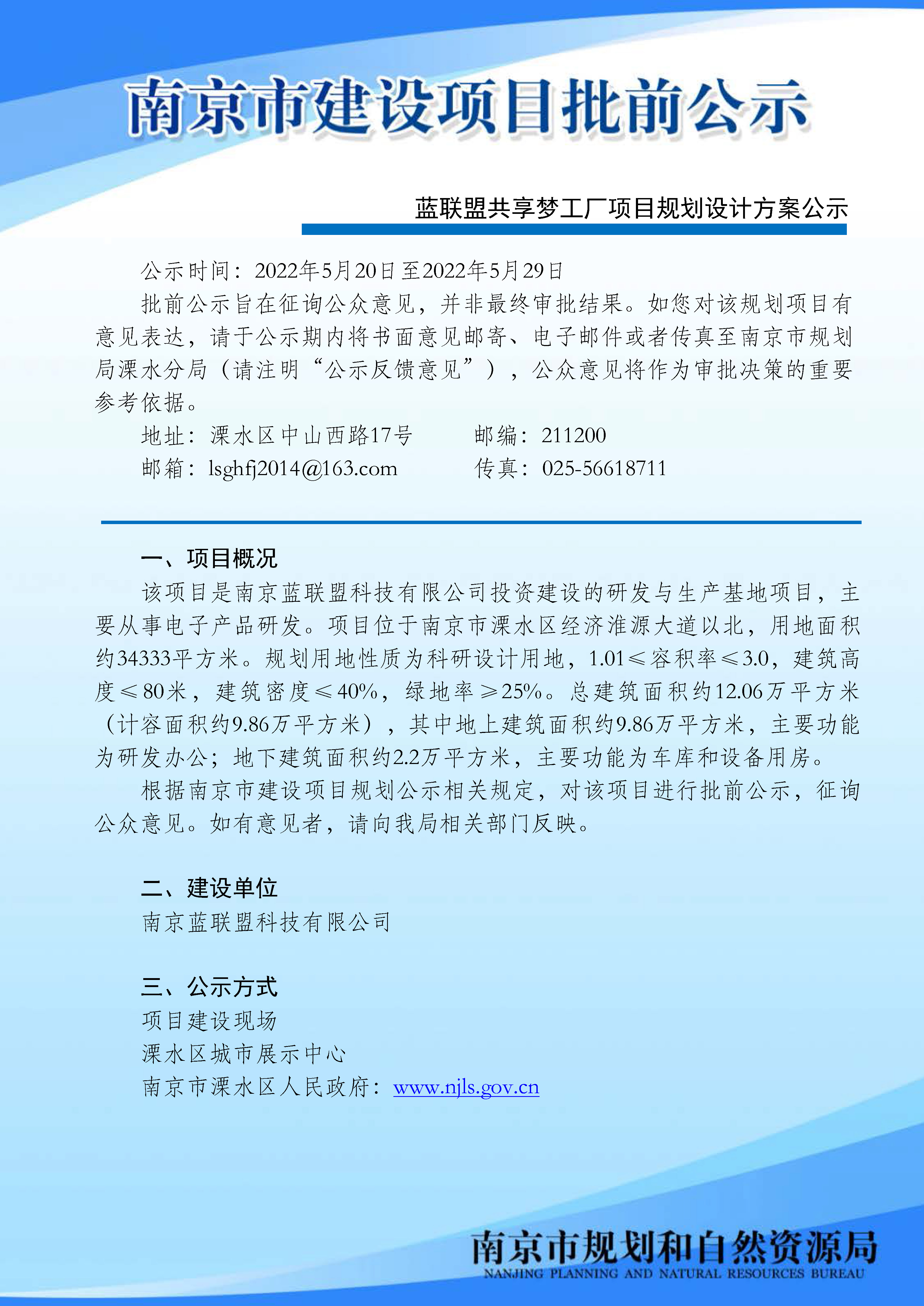 蓝联盟共享梦工厂项目规划设计方案批前公示