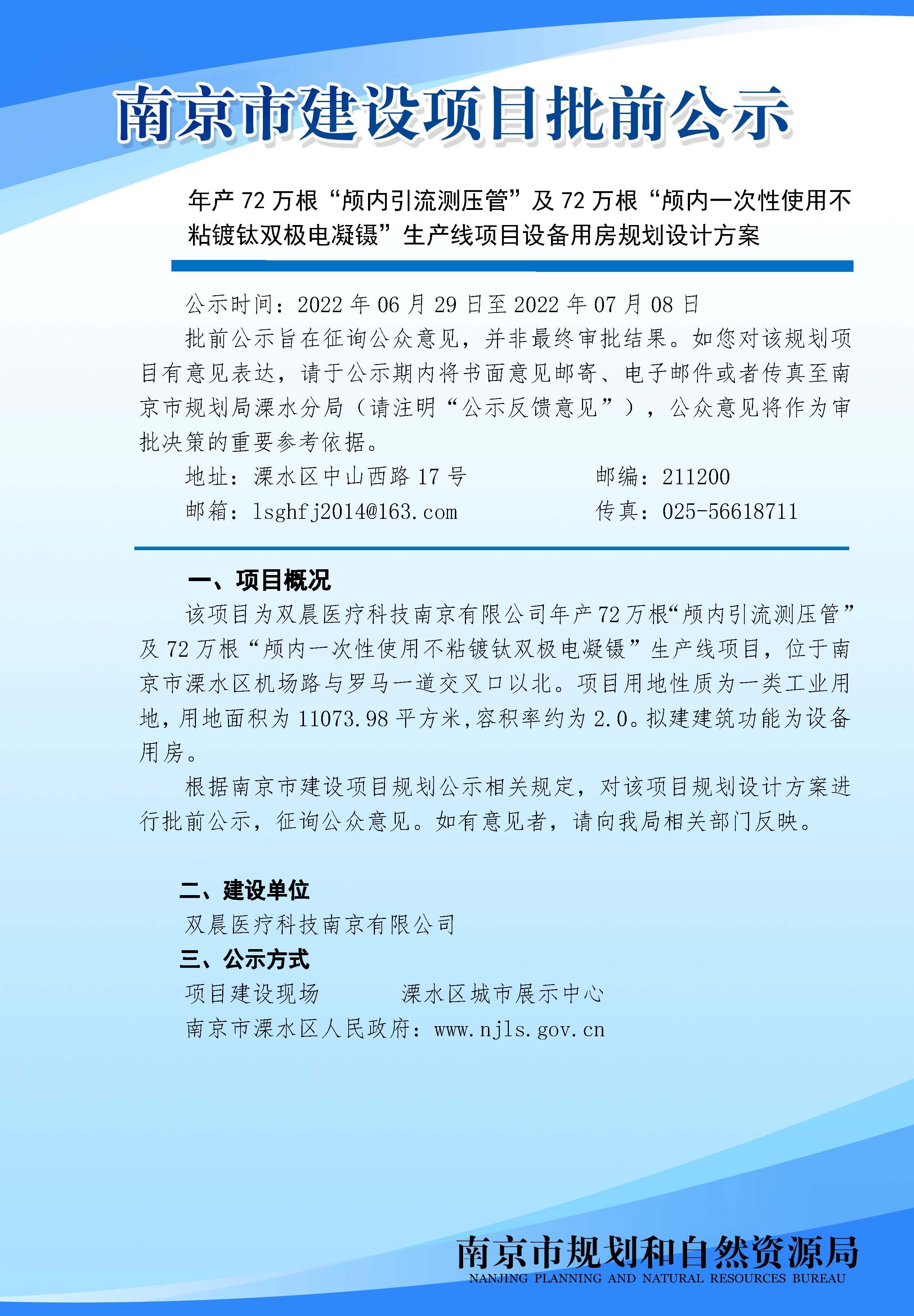 信息名称: | 年产72万根“颅内引流测压管”及72万根“颅内一次性使用不粘镀钛双极电凝镊”生产线项目设备用房规划设计方案公示 | ||