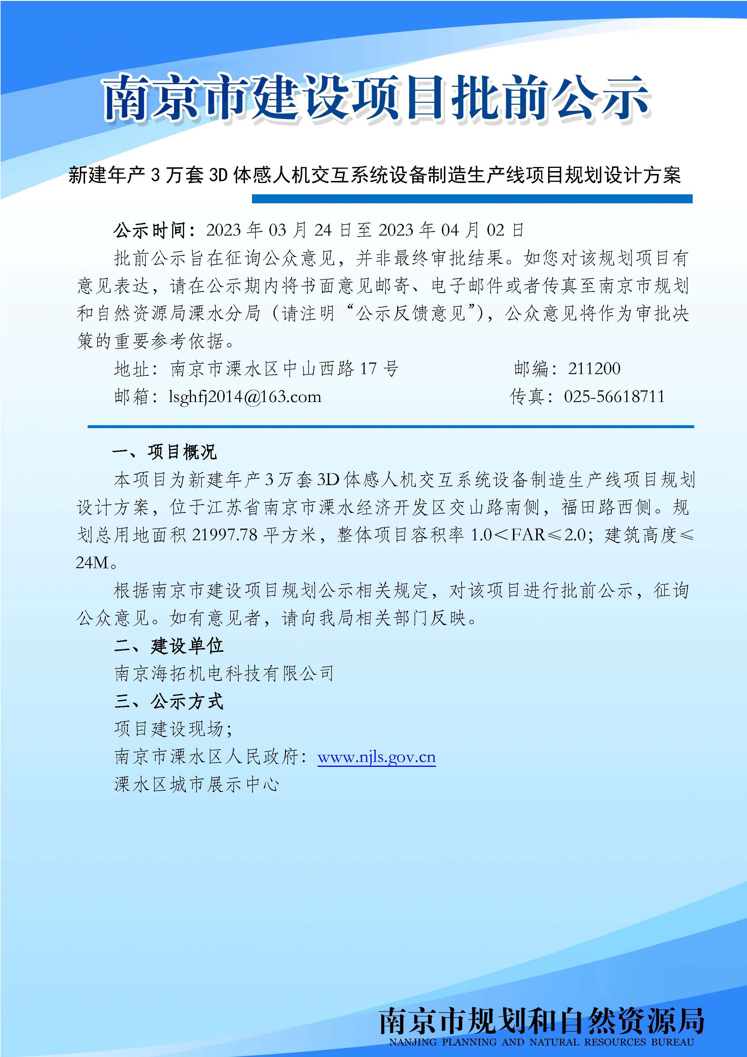 信息名称: | 新建年产3万套3D体感人机交互系统设备制造生产线项目规划设计方案批前公示 | ||