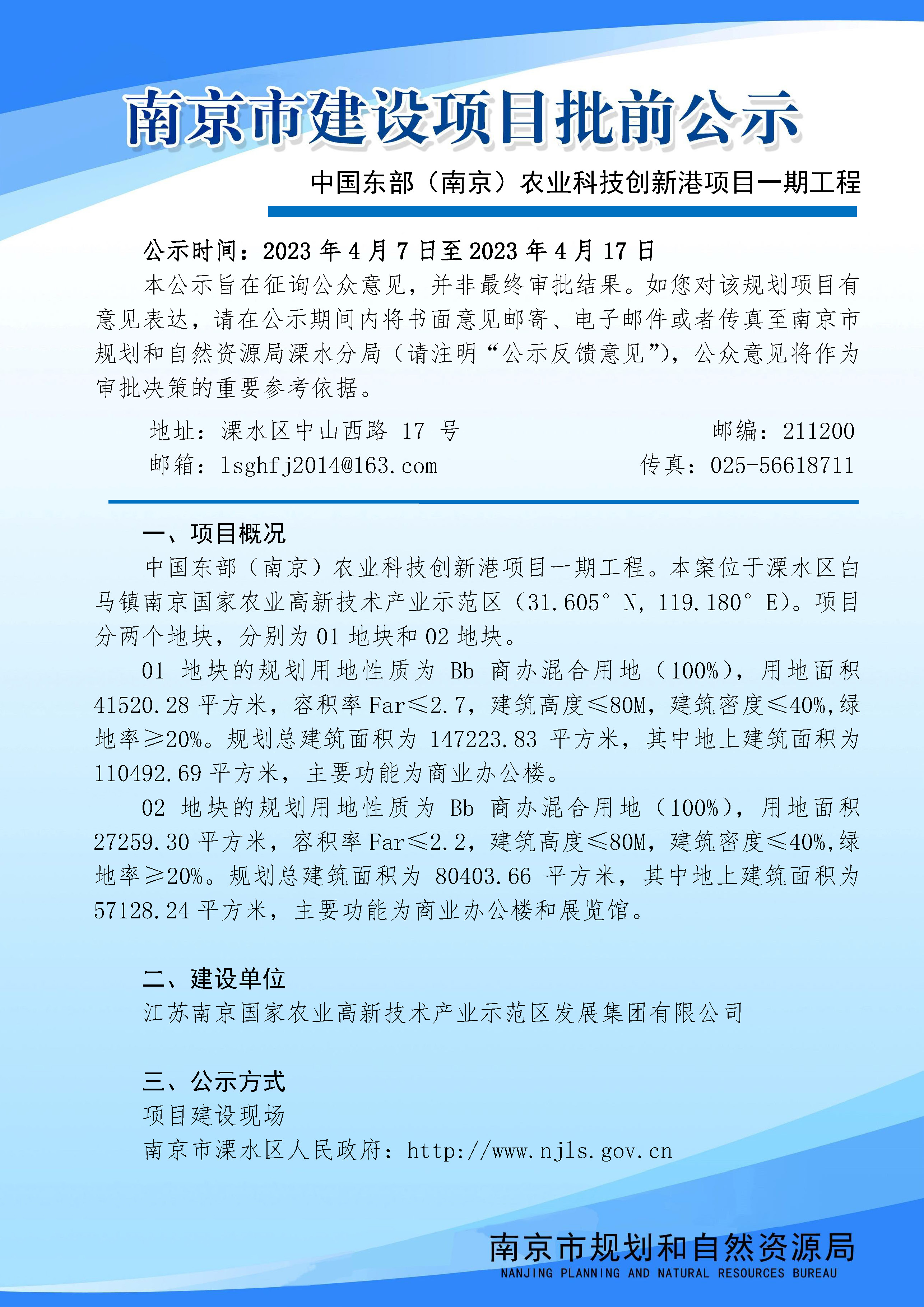 中国东部(南京)农业科技创新港项目一期工程批前公示