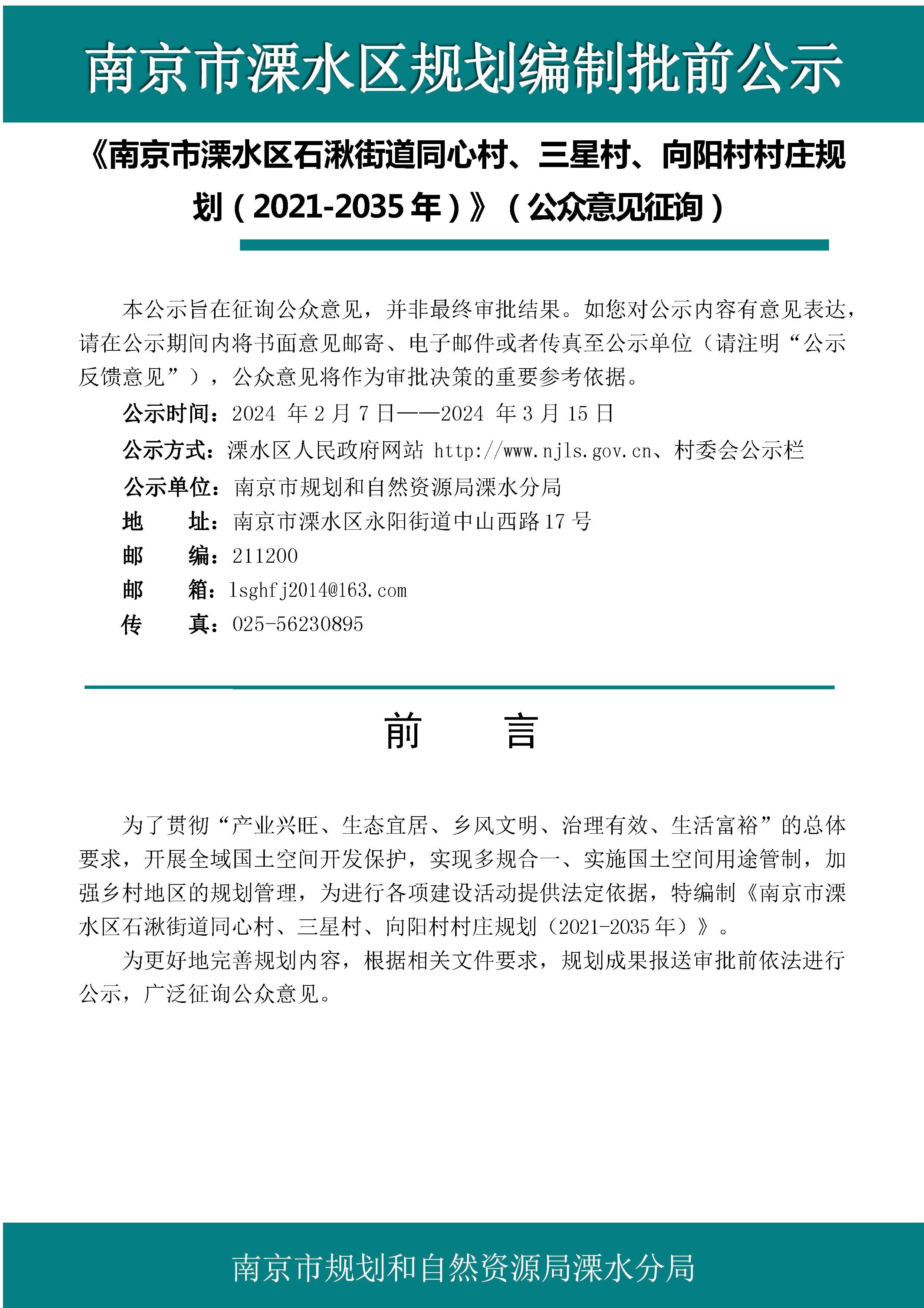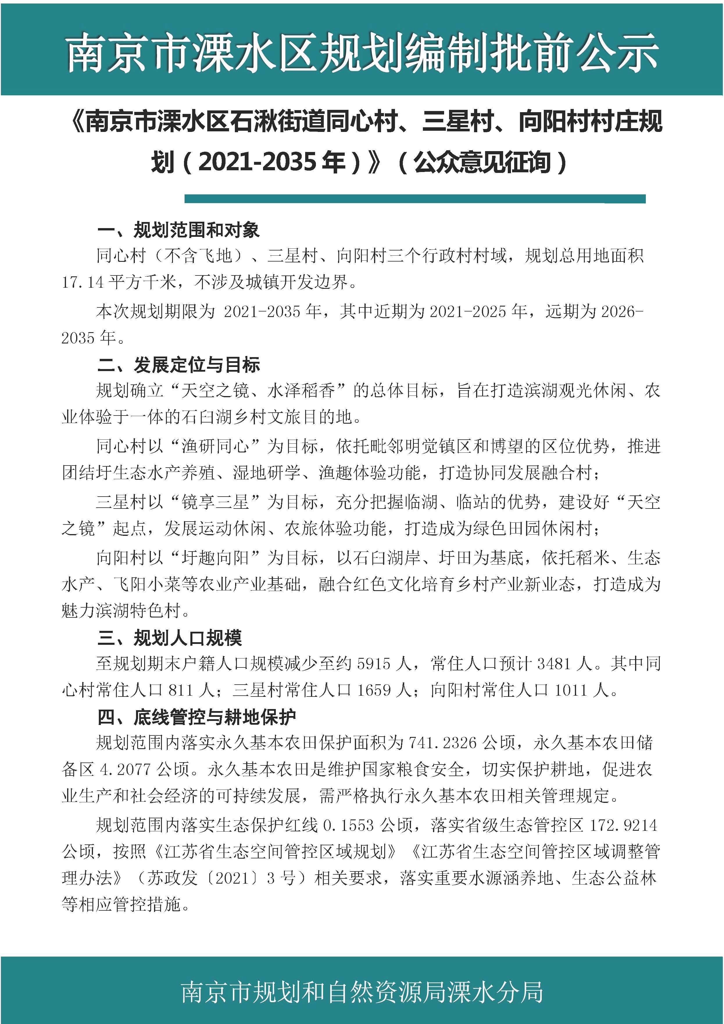 | 文 号: | 关 键 词: | 溧水区石湫街道同心村、三星村、向阳村村庄规划 | |