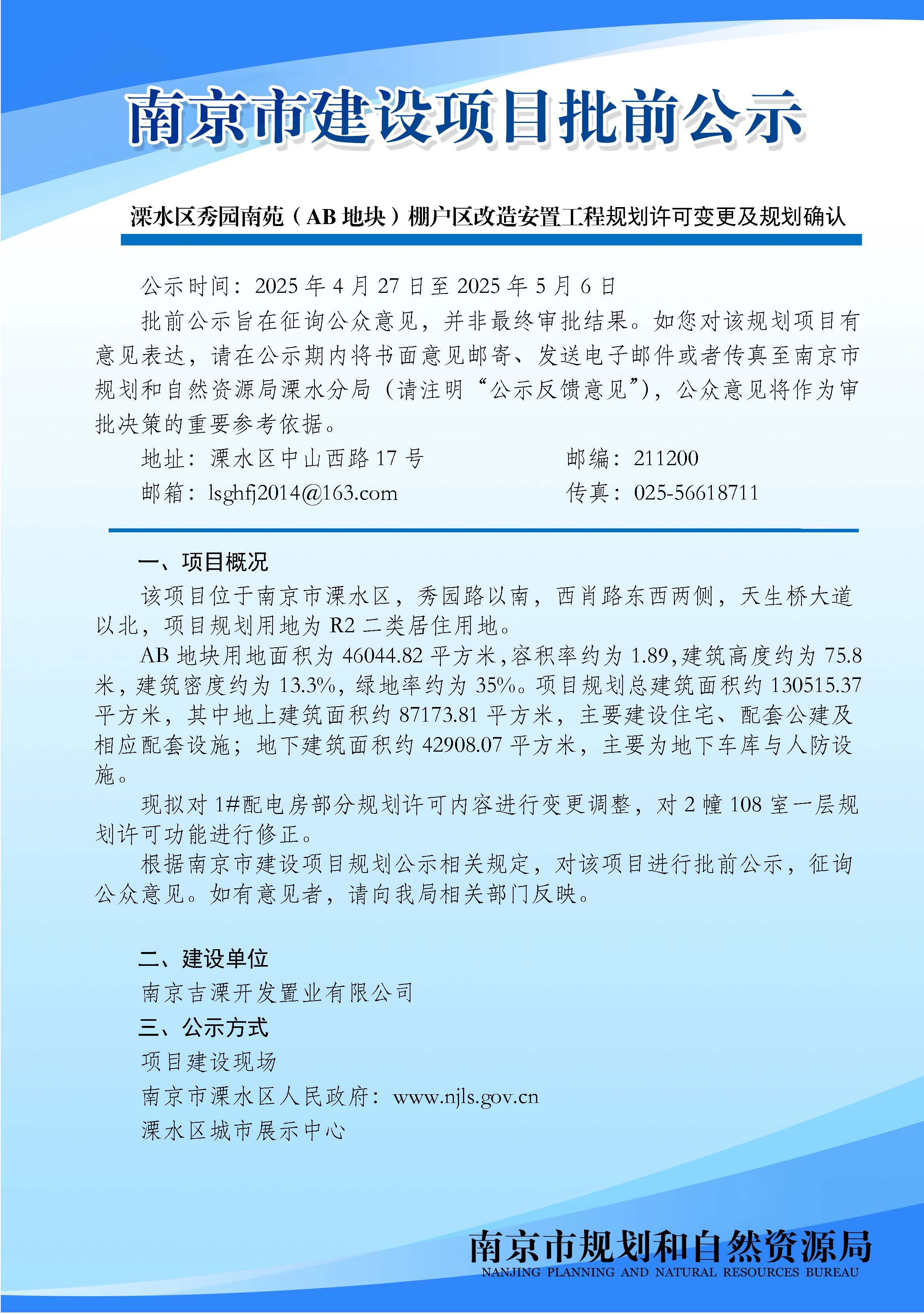 | 信息名称: | 溧水区秀园南苑(AB地块)棚户区改造安置工程规划许可变更批前公示 | ||