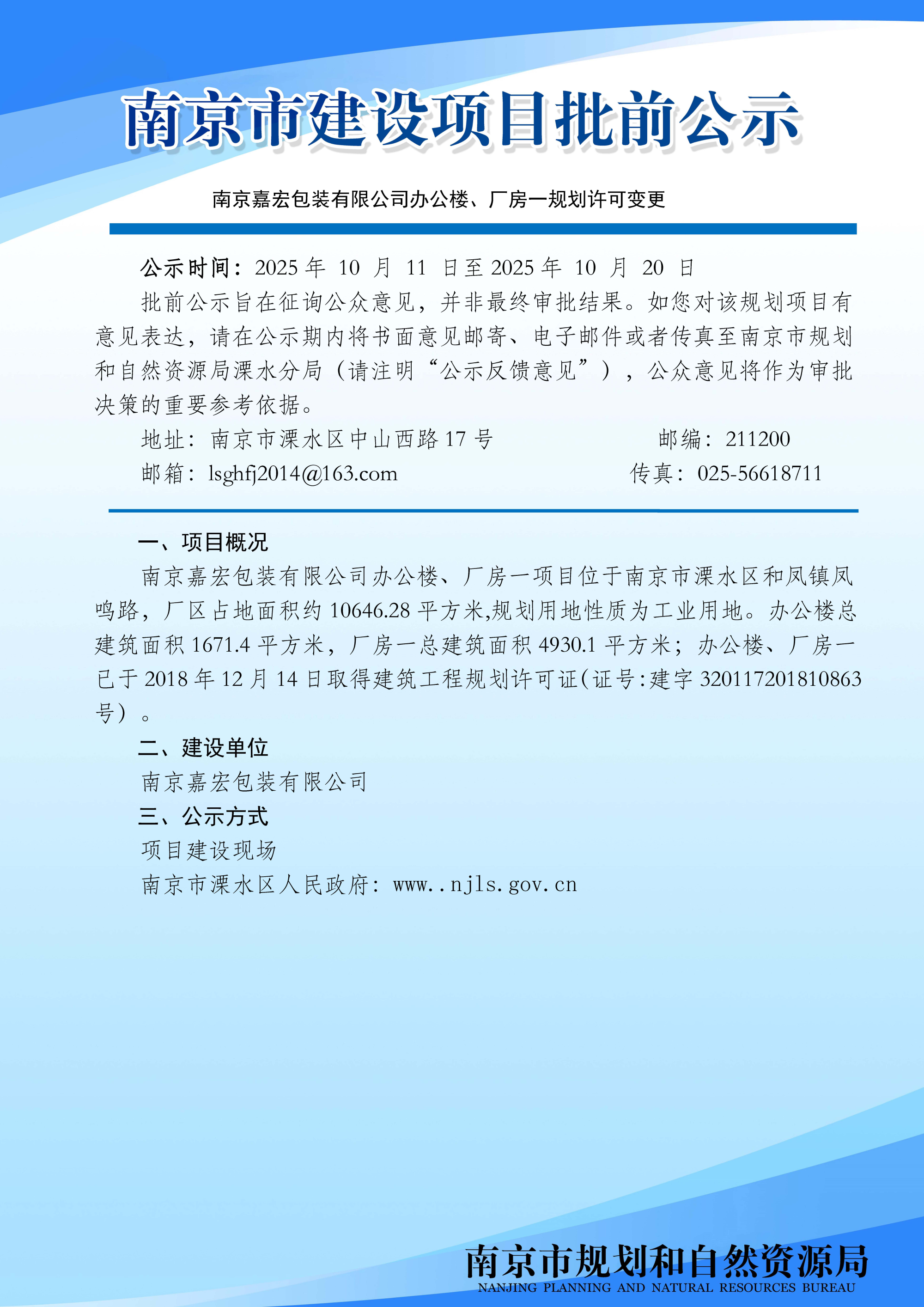 信息名称: | 南京嘉宏包装有限公司办公楼、厂房一规划许可变更批前公示 | ||