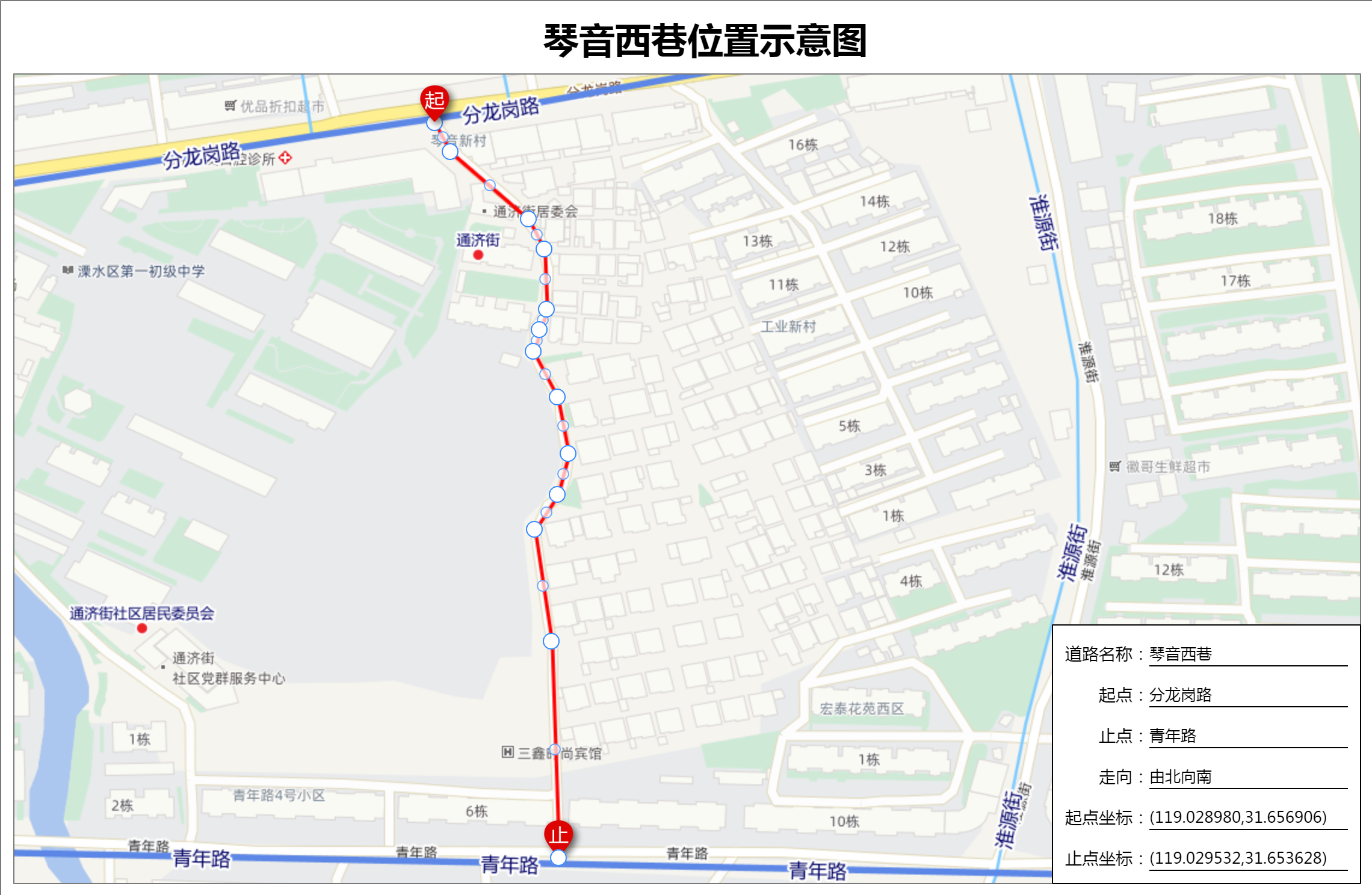 3 | 琴音西巷 | 分龙岗路 | 青年路 | 沥青 | 自北向南 | 附近有琴音新村,道路位于琴音新村西侧,因此命名。 | 2001.7 | 2001.9 |