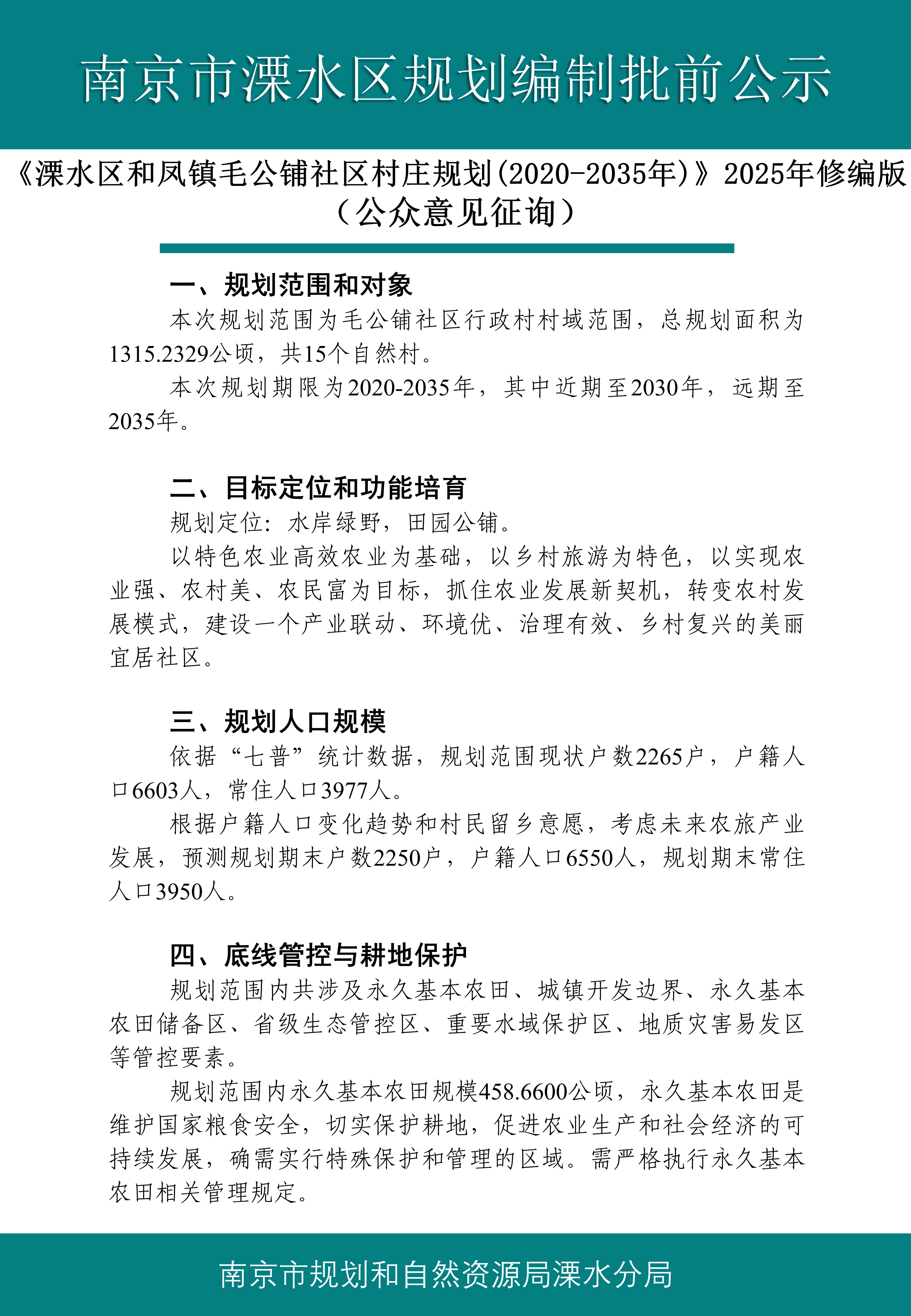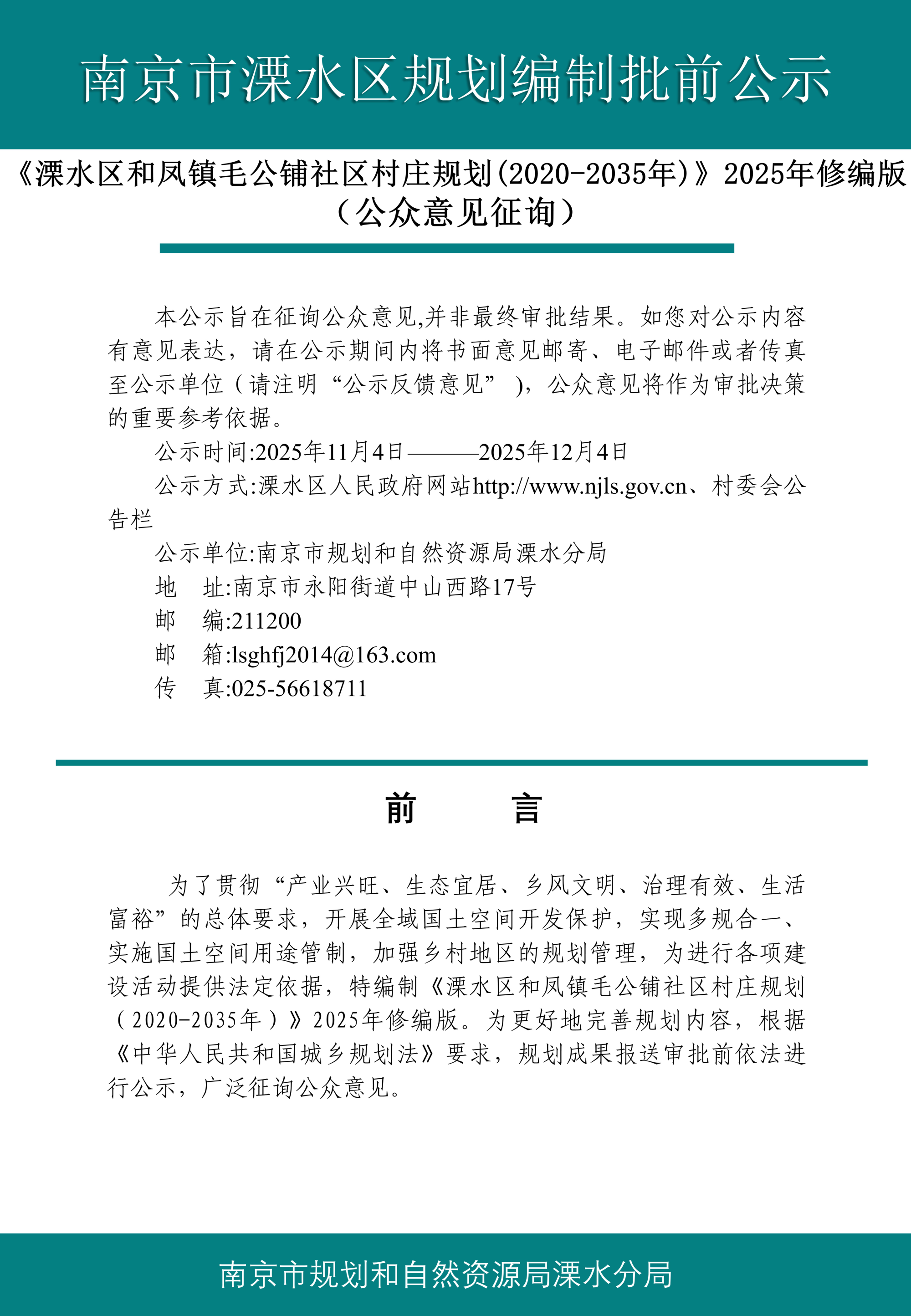 | 信息名称: | 《溧水区和凤镇毛公铺社区村庄规划(2020-2035年)》2025年修编版(公众意见征询)批前公示 | ||