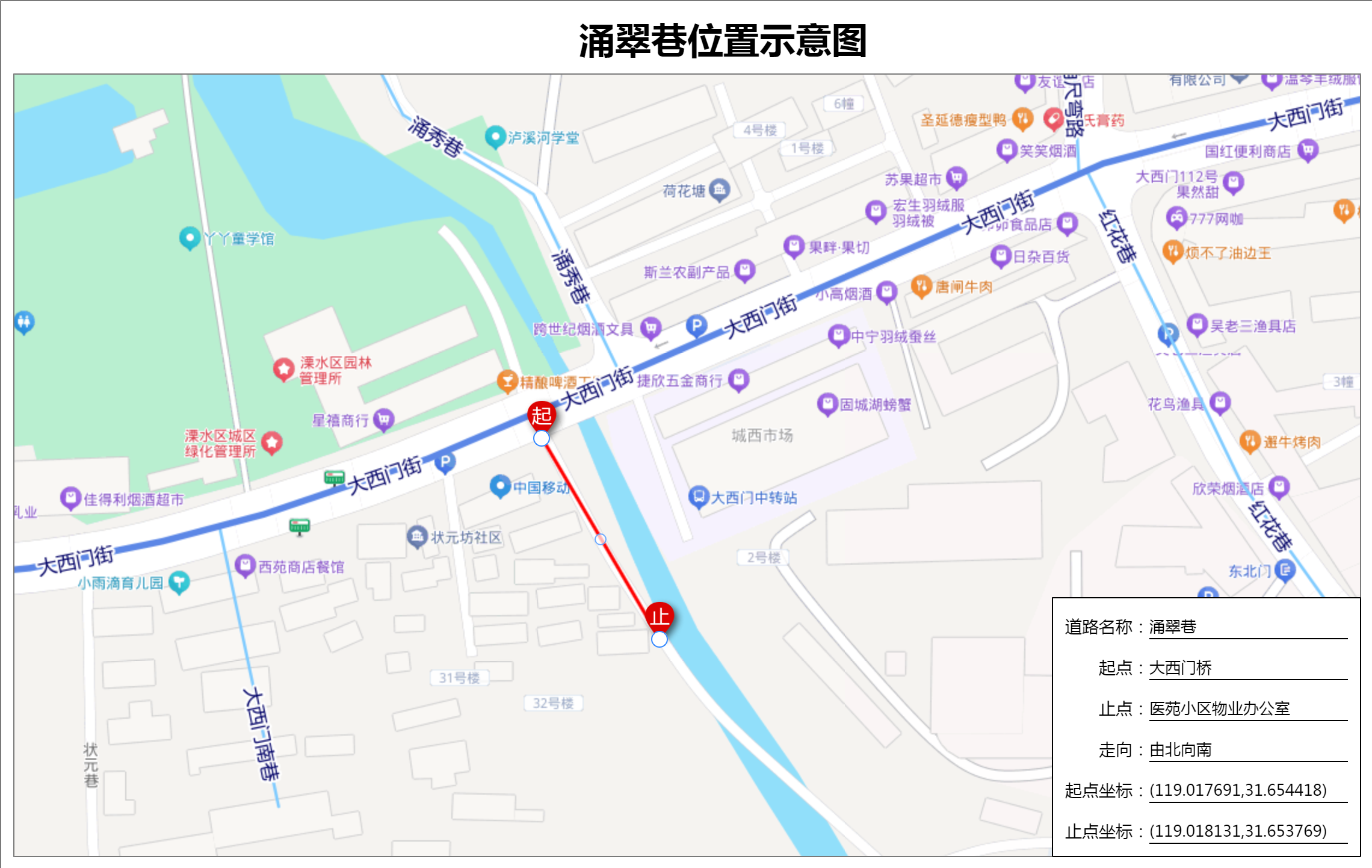2.“涌翠巷”(Yǒnɡcuì Xiànɡ):位于永阳街道,北起大西门桥,南止医苑小区物业办公室,长100米,宽5米,水泥路面。