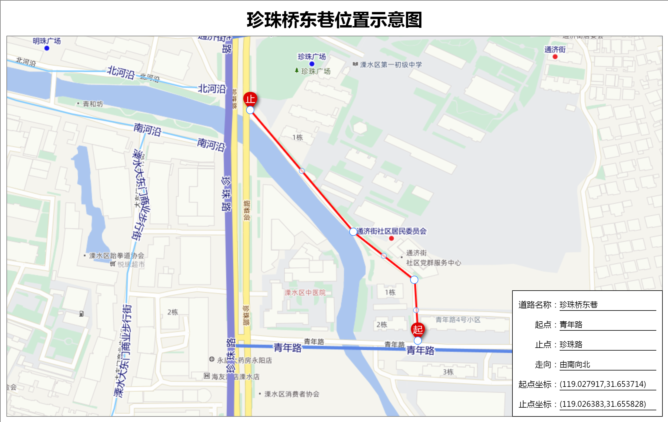 4.“珍珠桥东巷”(Zhēnzhūqiáodōnɡ Xiànɡ):位于永阳街道,南起青年路,北止珍珠路,长293米,宽3米,沥青路面。