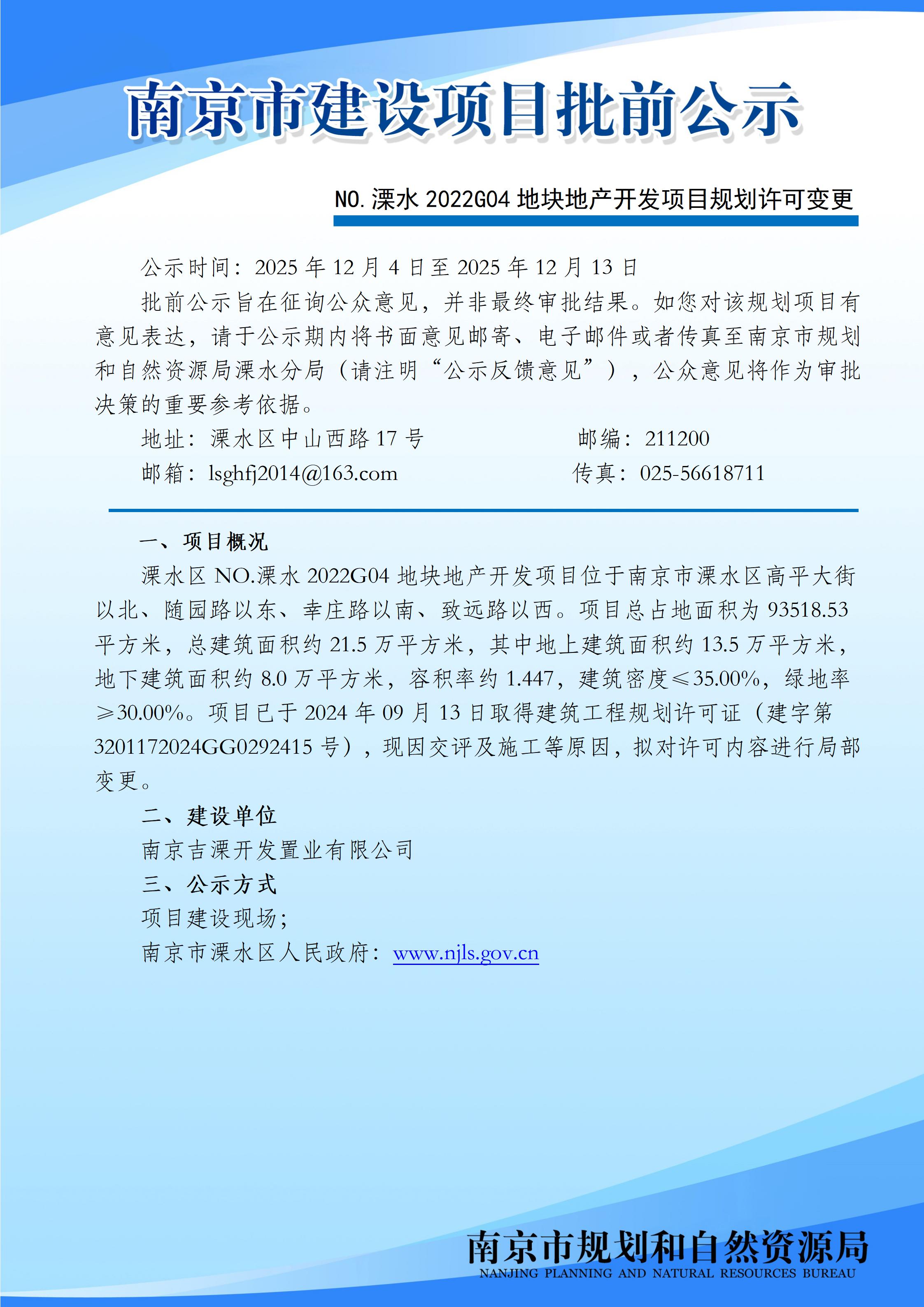 | 信息名称: | NO.溧水2022G04地块地产开发项目规划许可变更公示 | ||