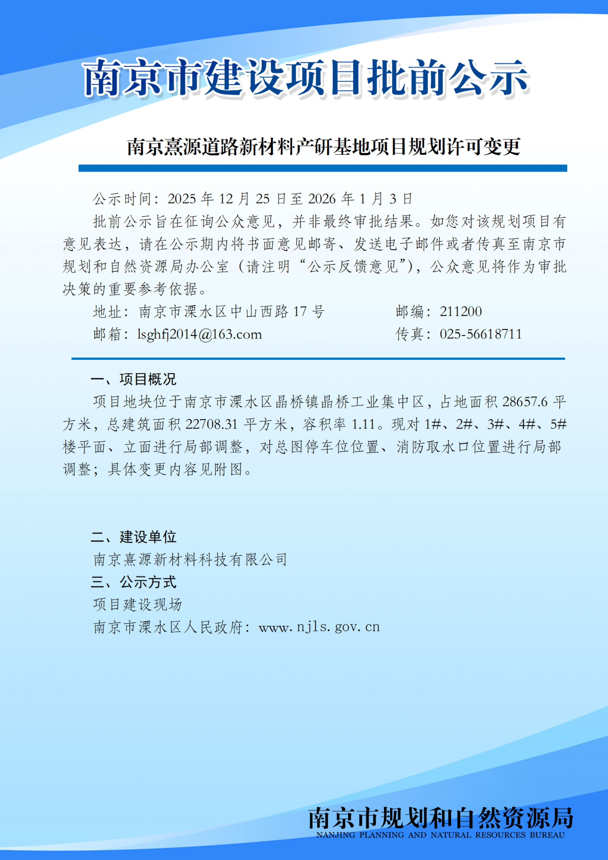 | 信息名称: | 南京熹源道路新材料产研基地项目规划许可变更批前公示 | ||