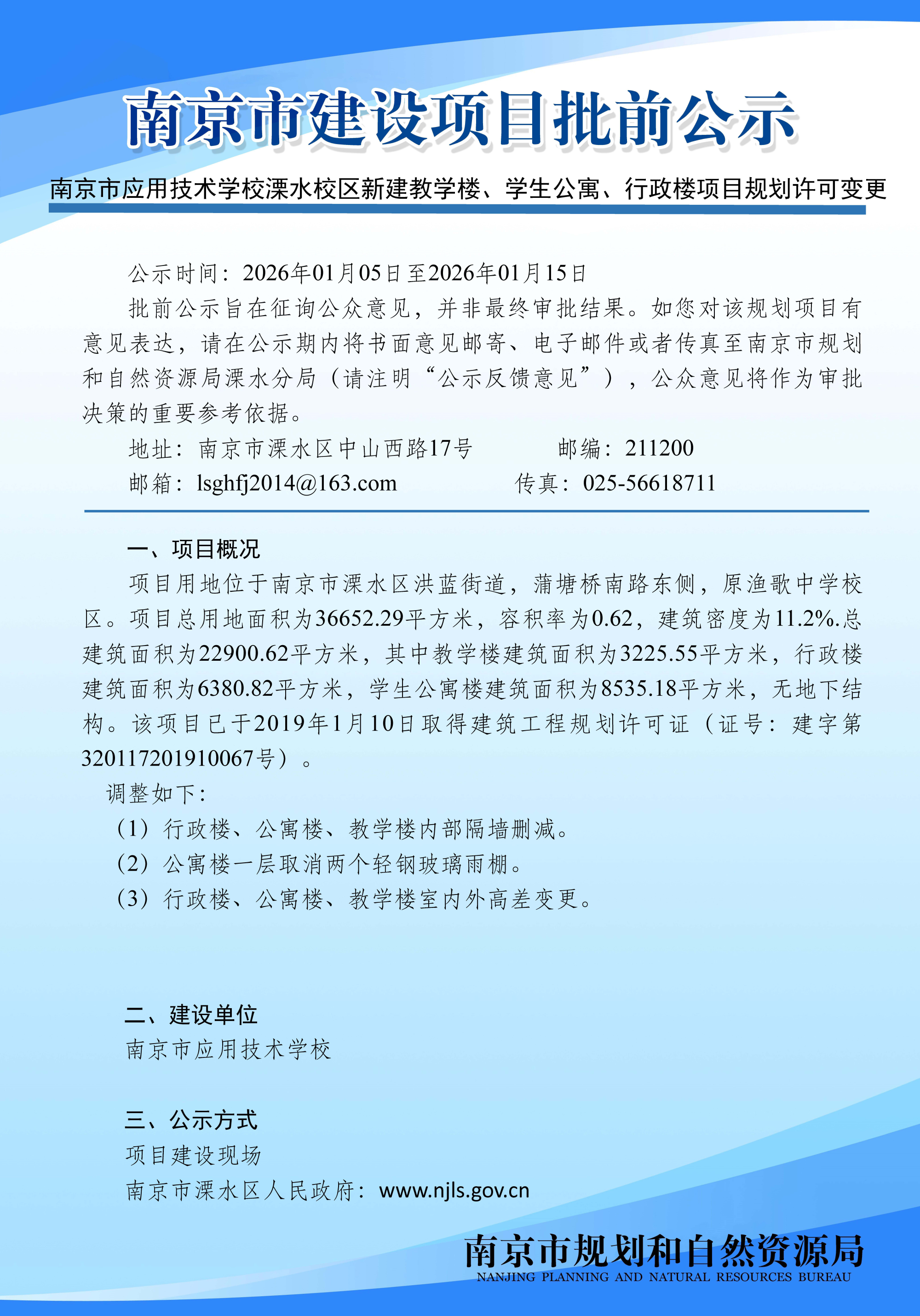 | 信息名称: | 南京市应用技术学校溧水校区新建教学楼、学生公寓、行政楼项目规划许可变更批前公示 | ||