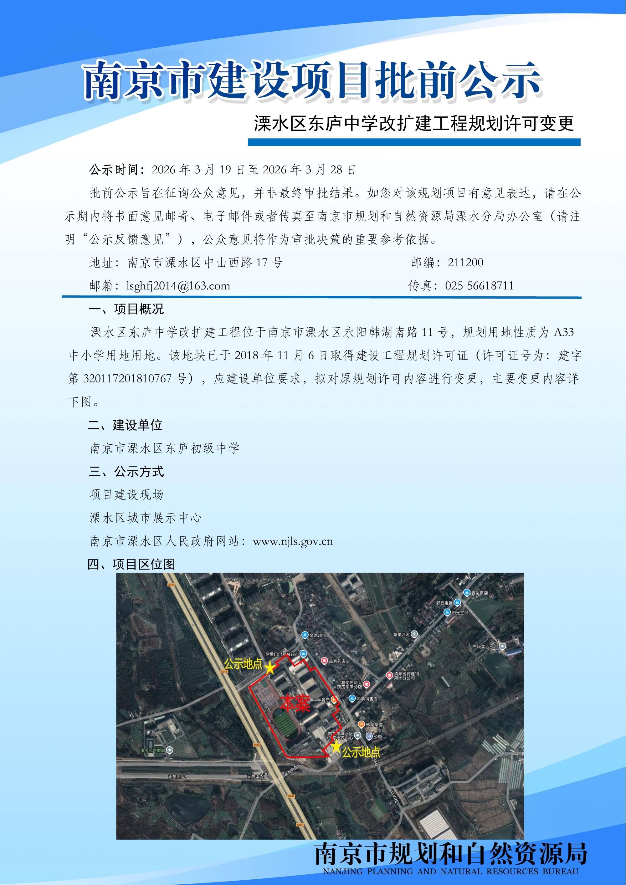 | 信息名称: | 溧水区东庐中学改扩建工程规划许可变更批前公示 | ||