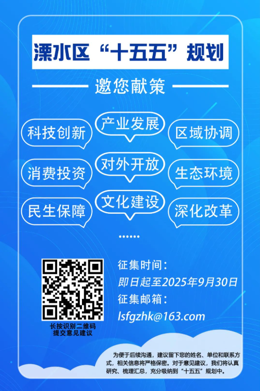 扫描二维码,提交您的意见建议;或发送电子邮件至(lsfgzhk@163.com),邮件主题为“姓名(或单位)+溧水区‘十五五’规划意见建议”,我们热切期盼您的畅所欲言。