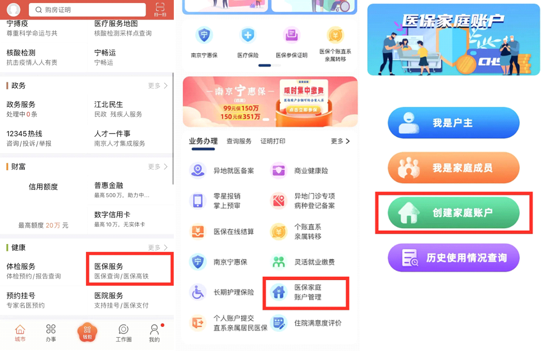 建立家庭账户可以通过"我的南京"APP中的“医保服务”模块,点击“医保家庭账户管理”创建,将南京市职工医保参保人和家庭成员绑定,向家庭账户注入个人账户资金后,参加我市居民医保的家庭成员在医院就医购药、疫苗费用支付时,直接刷自己的医保卡或医保电子凭证,自动使用家庭账户的资金支付相关医疗费用,无需其他任何手续。