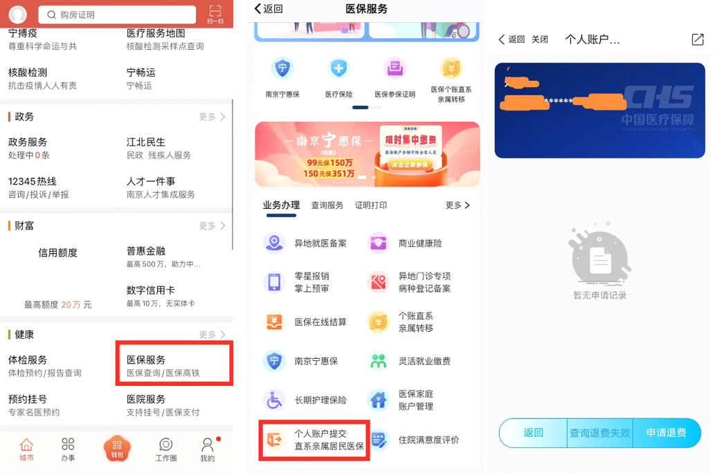 按照先缴费后退费的原则,在正常渠道完成参保缴费后,南京市职工医保参保人登录“我的南京”APP,点击“医保服务”模块中的“个人账户提交直系亲属居民医保”申请退费,大约3-5个工作日完成后台审批、职工医保个人账户扣款和银行卡退款。