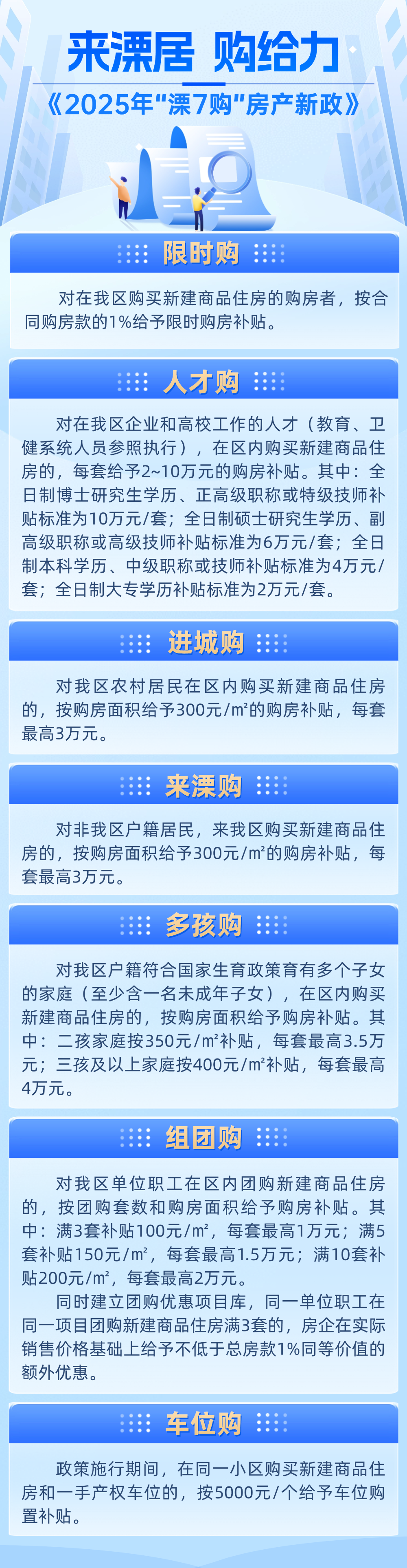 为深入贯彻落实国家、省市关于房地产市场发展的决策部署,溧水区重磅推出系列购房补贴政策,进一步支持刚性和改善性购房需求,提振市场信心,促进全区房地产市场持续向好发展。本次“溧7购”房产新政,在阶段性“限时购”的基础上,对区内人才、农村居民、多孩家庭以及区外户籍居民进行购房补贴,并叠加“组团购”“车位购”,政策主要内容共七条: