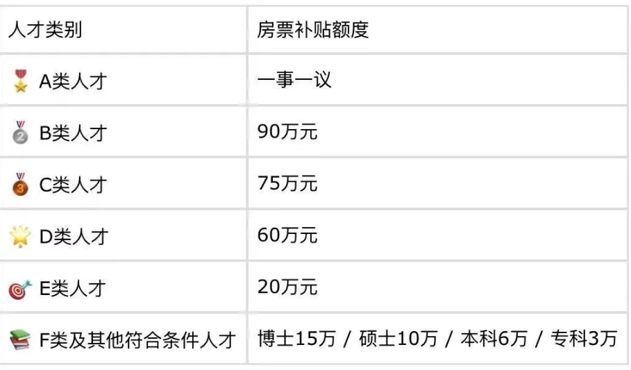 1、符合溧水区人才安居政策A-E类租赁补贴在保人才给予一次性人才房票,其中A类“一事一议”、B类为90万元、C类为75万元、D类为60万元、E类为20万元,剩余租赁补贴额度不叠加享受;